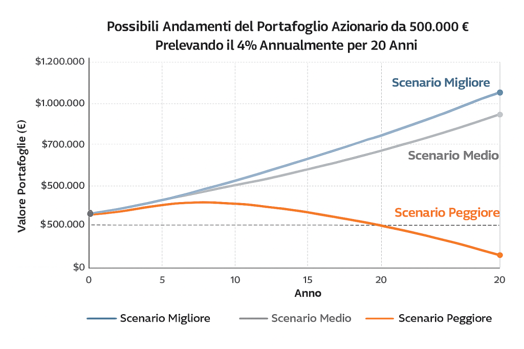 Se hai accumulato 500.000€, secondo la regola del 4% potresti prelevare 20.000€ all’anno senza esaurire il capitale, assumendo rendimenti medi storici.
