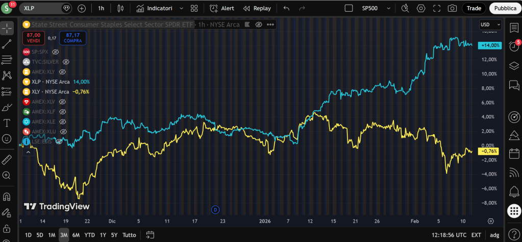 Uno di questi segnali arriva dal rapporto tra consumer staples e consumer discretionary, osservabile attraverso gli ETF XLP e XLY. Non si tratta di un indicatore tecnico di breve periodo, ma di una misura concreta di come stanno evolvendo le aspettative su consumi, crescita e fiducia economica.